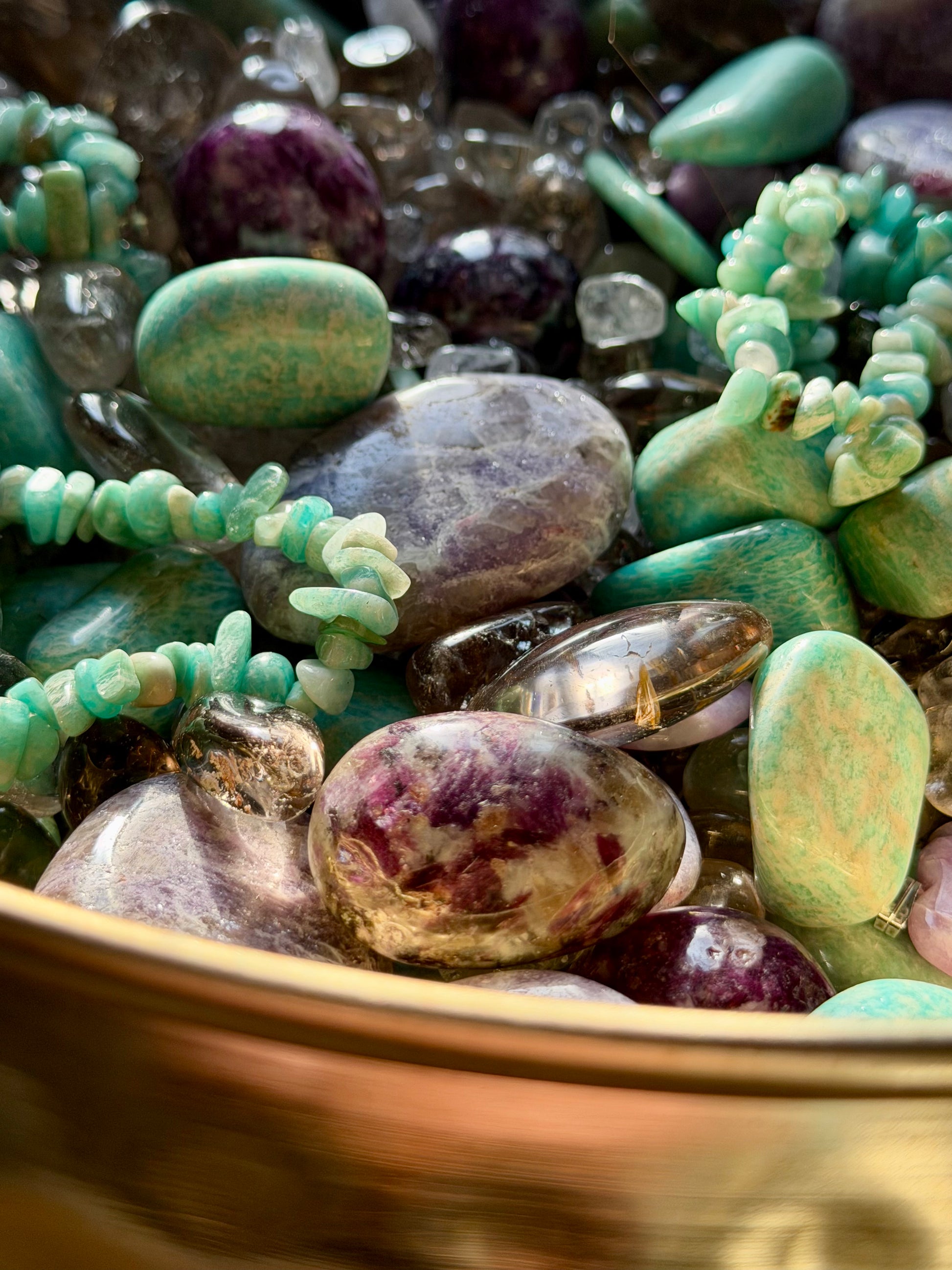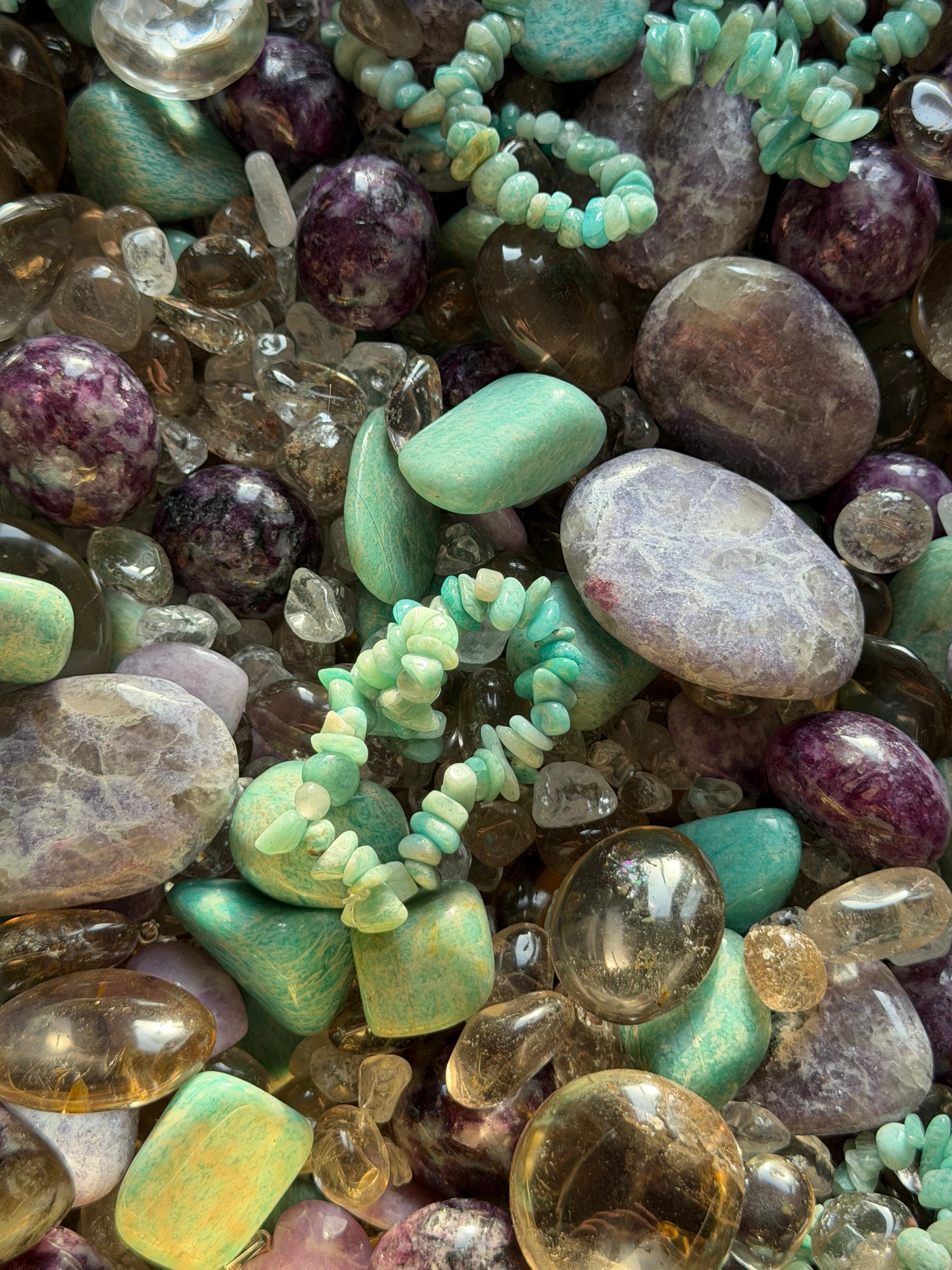 Lepidolith wird traditionell mit Ruhe und emotionalem Ausgleich verbunden. Rauchquarz steht für Erdung und Stabilität, während Bergkristall mit Klarheit und Energieverstärkung assoziiert wird. Amazonit wird mit Harmonie und innerer Balance in Verbindung gebracht. Gemeinsam schaffen die Steine eine ruhige, ausgleichende und harmonische Atmosphäre. ✨